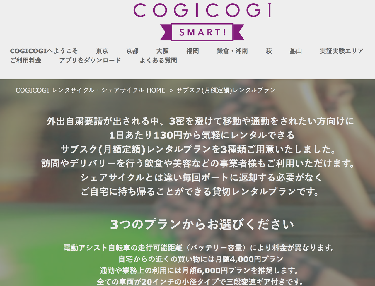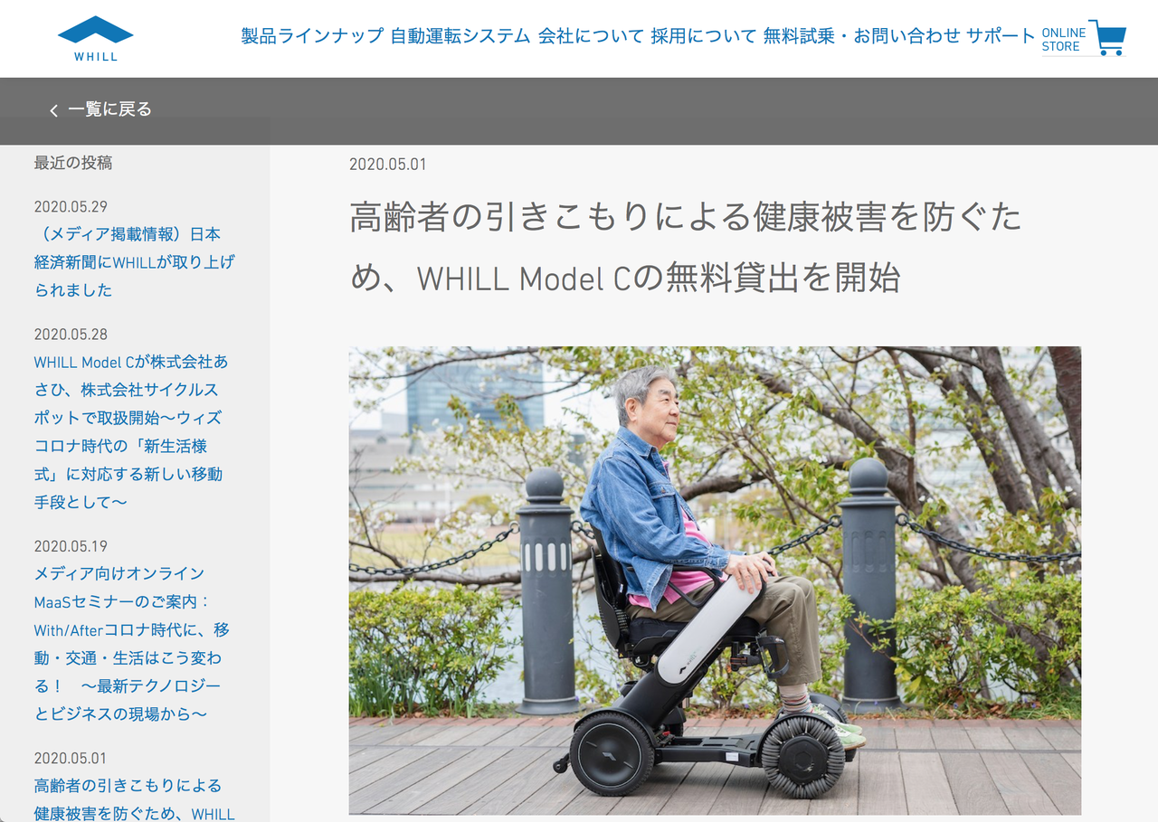 自転車では以前からいくつかの販売店が個別に定額制を用意していましたが、今年4月からは全国でレンタサイクルを展開するコギコギが新たに月額制メニューを用意するなどの動きが起こっています。また電動車いすのWHILLは緊急事態宣言を受けて、高齢者の引きこもりによる健康被害防止を目的に、5月から1か月間の無料貸出を開始しています。WHILLでは販売、シェアリングに並ぶ第三の柱としてレンタル事業を考えているとのことです。