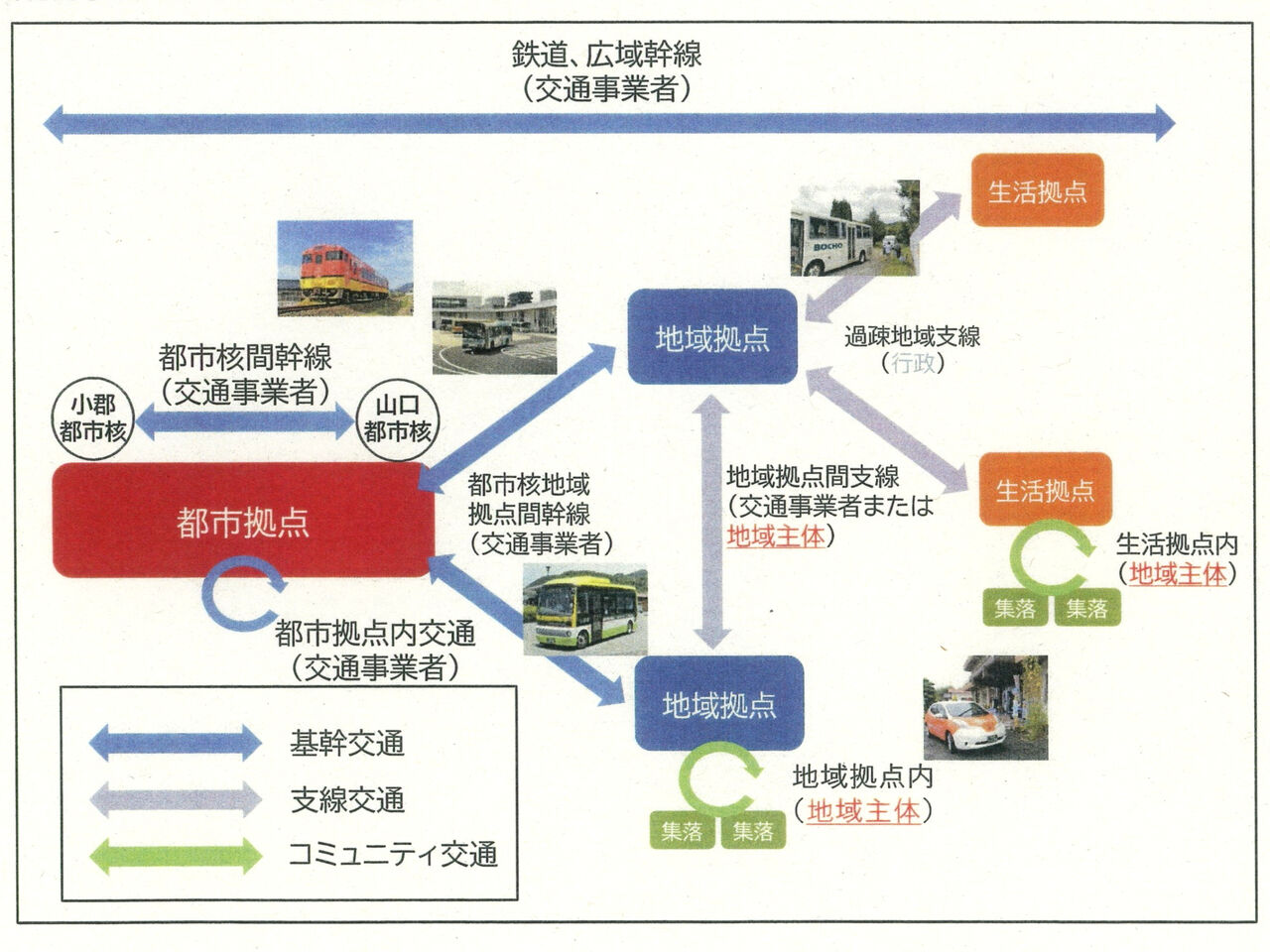 山口市は2005年と2010年に周辺の町と合併することで、市域を拡大してきました。同市ではこのうち山口と小郡を都市核、小郡以外の合併前の旧町拠点を地域核と考え、それぞれの核の間はJRなどの交通事業者が輸送を担当することにする一方、地域核と生活拠点を結ぶ交通などについては、住民が主体となって交通を整備することにしたのです。わかりやすい役割分担だと思っています。