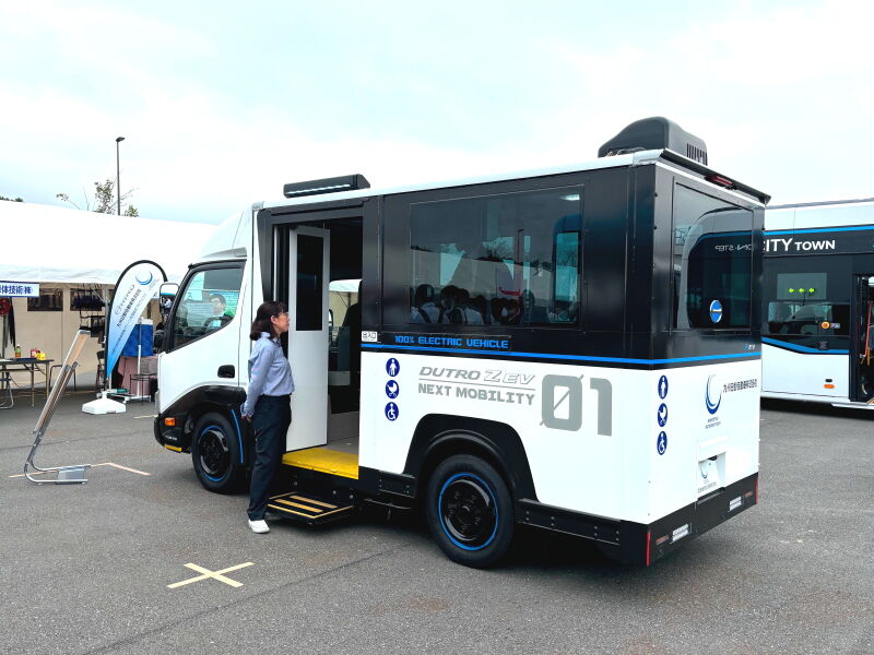 同じ前輪駆動で、日野「デュトロZ EV」をベースの小型バスの試作車も目を惹きました。西鉄(西日本鉄道)グループの西鉄車体技術と日野が共同開発したもので、ちょうど先代ポンチョに似た成り立ちで、デザインはもう少し洗練させてほしいところですが、全高を除けば5ナンバーサイズで、床の高いワンボックスタイプより、利用者に優しい乗り物になりそうです。