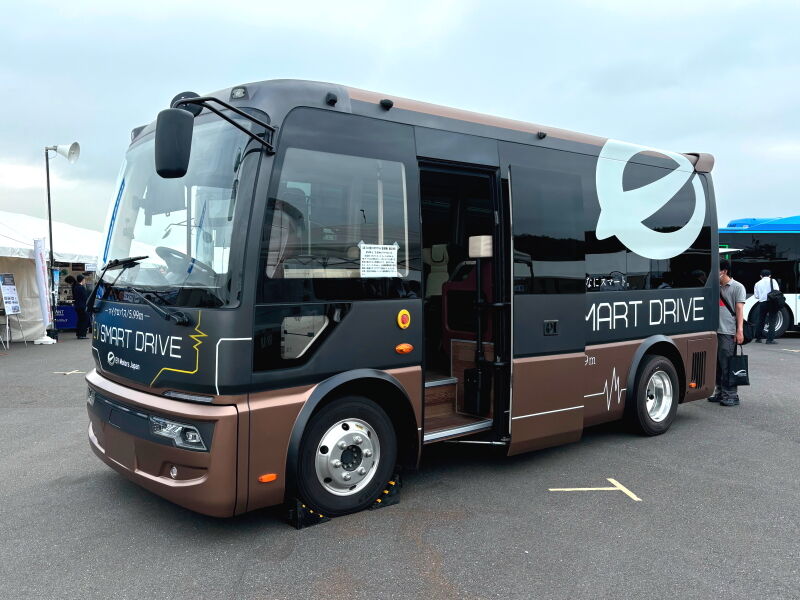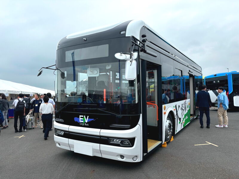 すでに国内各地でいくつかのサイズの電気バスを投入しているEVモーターズ・ジャパンは、既存の中型バスF8の新型と、コミュニティバス用よりさらに小型の車両を展示していました。後者は世界初公開で、全長5.99m、乗車定員11名ということでした。こちらは床が高めなのが気になりましたが、サイズ感は日野+西鉄車体技術の車両同様、地域輸送にフィットしそうだと感じました。
