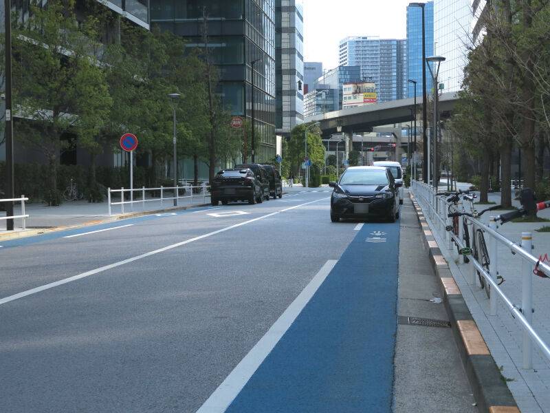 自転車が車道左端を走るのは、本来のルールどおりであり、個人的には一歩前進だと思いますが、そうなると自転車走行空間が確保されているかという問題が新たに浮かび上がります。自転車レーンそのものは、東京都内では路上にペイントで示した簡易的なものを含め、増えていると感じていますが、写真のように駐車車両がレーンをふさいでいることも多くあります。