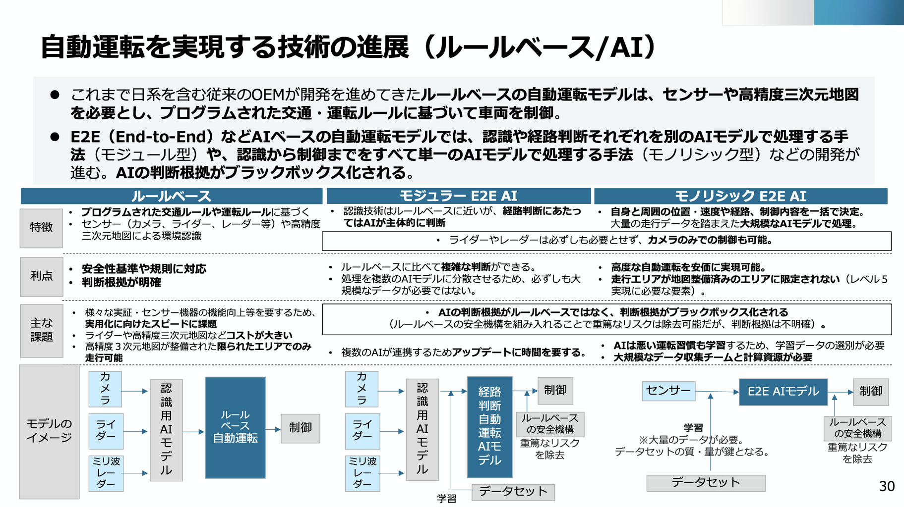 E2E方式は、ルールベースでは戸惑ってしまう、路上駐車や道路工事などにも柔軟に対応できるほか、高精度地図が必要ないので、道を選ばずどこでも行けるという利点もあるそうです。なので限定領域で完全自動運転を実現するレベル4の上、限定領域なしのレベル5にはこちらのほうが適していると言われています。しかもLiDARや高精度地図を使わないため、コスト面でも有利です。だからでしょう、経済メディアでも取り上げることが多くなっています。