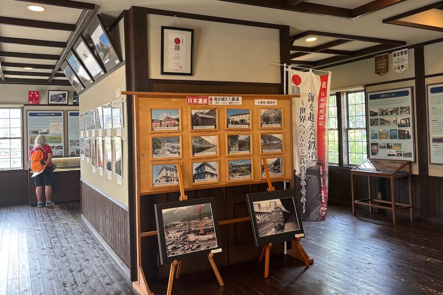 かつて敦賀港駅があった場所には、こうした歴史を後世に伝える「人道の港 敦賀ムゼウム」があります。そして海辺に広がる緑が心地よい金ヶ崎緑地を挟んで西側には、敦賀港駅舎を再現した「敦賀鉄道資料館」が、欧亜国際連絡列車や国内最初の本格的交流電化の足跡を資料や写真で紹介しています。