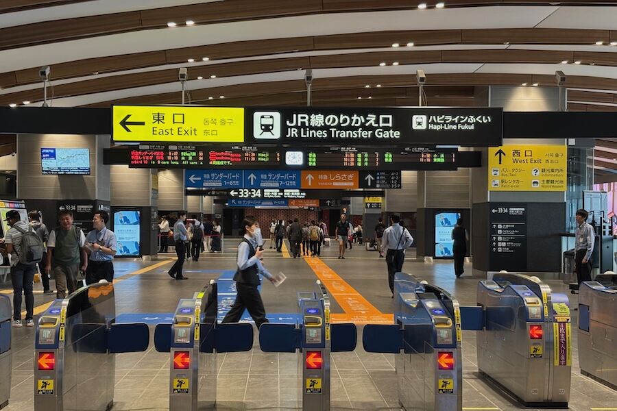 最初に乗換について書くと、新幹線ホームから直下にある在来線特急「サンダーバード」「しらさぎ」専用ホームまでは、乗客がそれほど多くなかったためもあって5分ぐらいで着きました。あっけないと感じるほどでした。しかしそこから同じJR西日本の小浜線、以前は北陸本線だった第3セクターのハピラインふくいのホームまでは、100mぐらい通路を歩くことになります。この2路線への乗換はちょっと大変かもしれません。